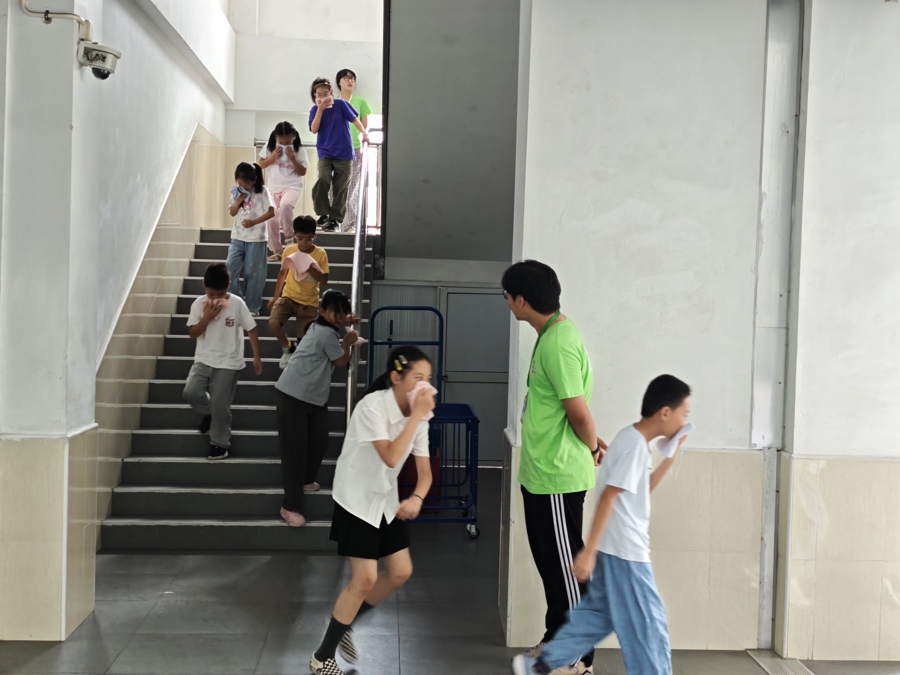“烟雾来了!快像小乌龟一样弯腰,用湿毛巾捂鼻子!”随着模拟火情信号发出,逃生演练正式开始。在消防员的引导下,孩子们化身“消防小勇士”,手捂毛巾、低姿弯腰,沿着墙壁有序向操场疏散,整个过程紧张有序,短短几分钟便完成安全撤离。“原来着火时要这样保护自己!”一名参与演练的学生说,亲身体验让他对逃生技能印象更深刻。