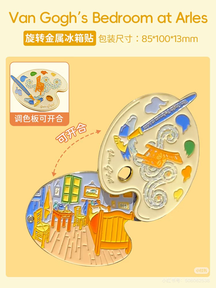 表面是奶油色的调色盘,轻轻一转,便是一幅缩小版的《梵高在阿尔勒的卧室》,床、椅子、窗户、挂画,名画的每个细节“等比缩小”,复刻在一张小小的冰箱贴上。