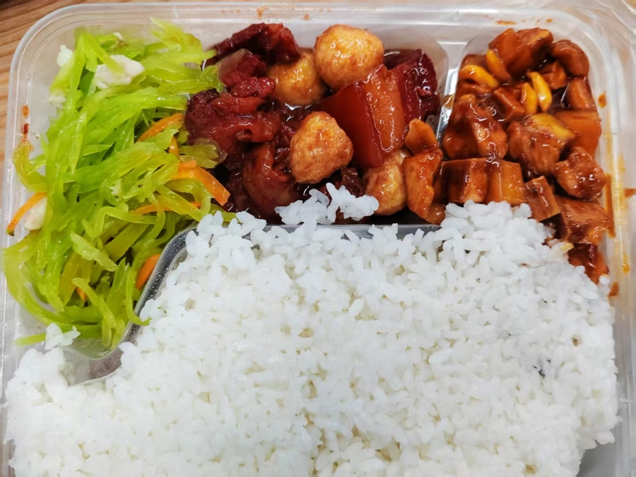 记者打开杨师傅的盒饭盖子,看到里面有鹌鹑蛋烧红烧肉、宫保鸡丁和莴笋炒干丝,还有满满的米饭。他说,他们站点的快递员以前都是从家里带饭,中午凑合吃冷饭冷菜,但又舍不得到外面饭店吃,否则一顿饭起码二三十元。现在社区食堂有了专门针对快递小哥的套餐,他们天天中午都来买,拿回站点里吃,“中午我们都很忙的,要到下午一点半才能忙好这一波,两点半又要来新一批货物了,所以,这里又便宜又快,特别适合我们!”