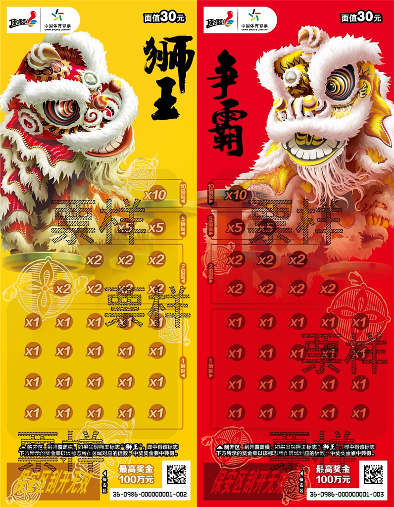 “狮王争霸”面值30元,最高奖金100万元,“狮王争霸”票面带着浓厚的传统文化氛围,一黄一红票面组合形成“狮王争霸”对立之势,两头醒狮对垒的生动场景跃然于票面之上。玩法上,刮开覆盖膜,如果出现狮王标志,即中得该标志下方所示的奖金乘以该标志所在区域对应的倍数。中奖奖金兼中兼得。