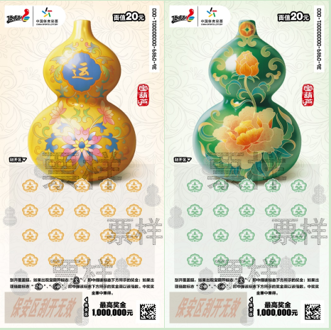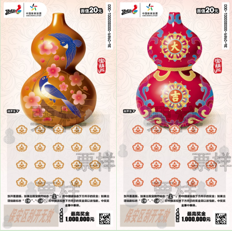 “宝葫芦”即开票面值20元,最高奖金100万元,采用象征“福禄”的精美葫芦为主形象,共有7款“葫芦”票面,每款设计精致大气,体现了中国传统文化的底蕴。不同“葫芦”包含了祥云、牡丹、玉如意、喜鹊、鲤鱼、寿桃等吉祥元素,凸显秋日“好彩头”。玩法上,刮开覆盖膜,如果出现宝葫芦标志,即中得该标志下方所示的奖金;如果出现倍数标志,即中得该标志下方所示的奖金乘以该倍数。中奖奖金兼中兼得。