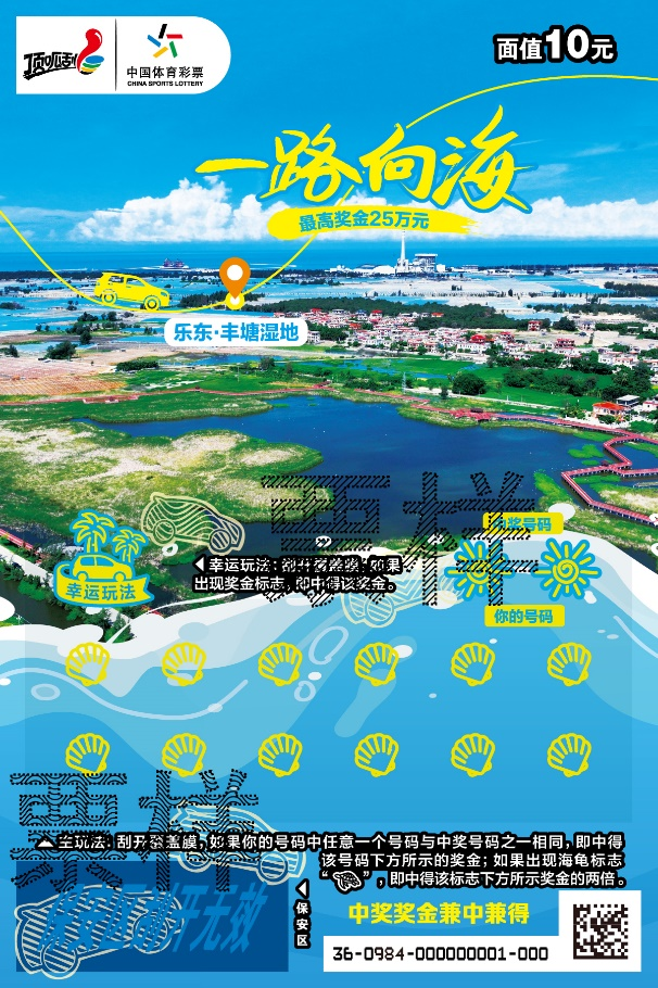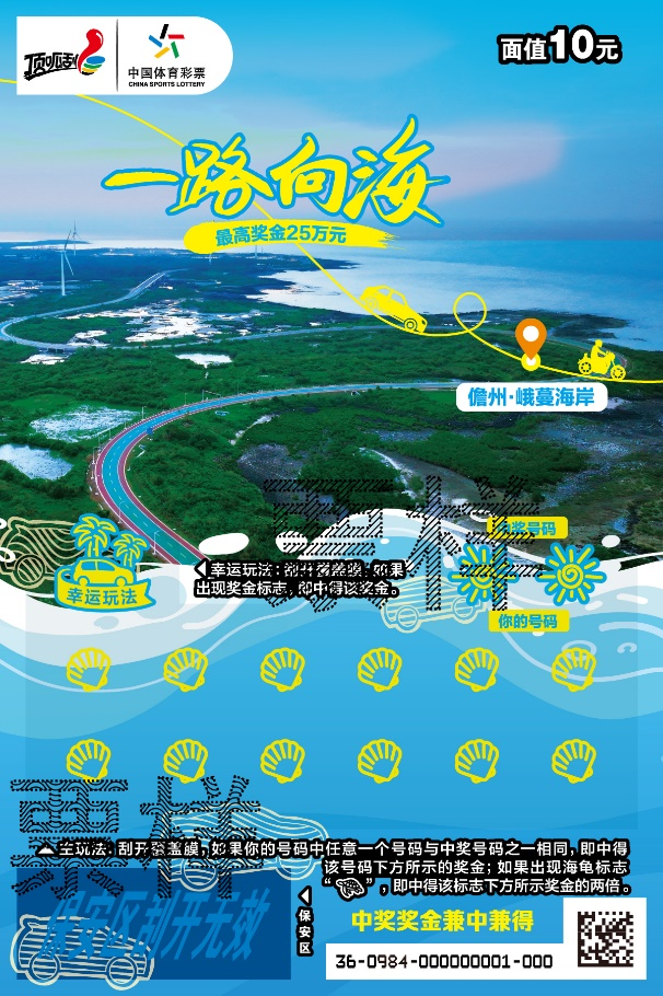 “一路向海”即开票是一套海南旅游主题即开型体育彩票。整套含15张票面,以海南环岛旅游公路沿线的自然风光和景区为设计主题。每张面值10元,最高奖金25万元,包含2种玩法,主玩法为刮开覆盖膜,如刮出奖金金额即获得该奖金;幸运玩法为如刮出奖金标志,则中得该奖金。中奖奖金兼中兼得。