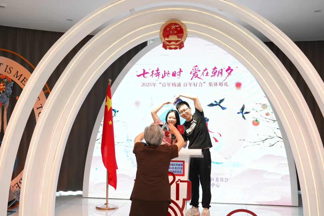 在杨浦,区婚姻登记中心成为传统节日与新式浪漫的交汇点,一场由杨浦区民政局主办的“‘七’待此时,爱在朝‘夕’”政府开放月主题活动暨“百年杨浦·百年好合”婚姻文化主题活动在这里拉开帷幕,邀请新人们以集体颁证、传统婚俗体验等形式,共同许下爱的诺言。