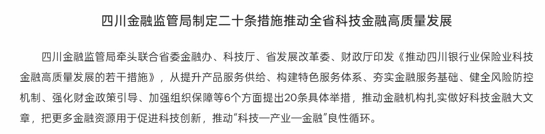 9月8日,四川金融监管局发布关于制定二十条措施推动全省科技金融高质量发展的通知,四川金融监管局牵头联合省委金融办、科技厅、省发展改革委、财政厅印发《推动四川银行业保险业科技金融高质量发展的若干措施》,从提升产品服务供给、构建特色服务体系、夯实金融服务基础、健全风险防控机制、强化财金政策引导、加强组织保障等6个方面提出20条具体举措,推动金融机构扎实做好科技金融大文章,把更多金融资源用于促进科技创新,推动“科技一产业一金融“良性循环。