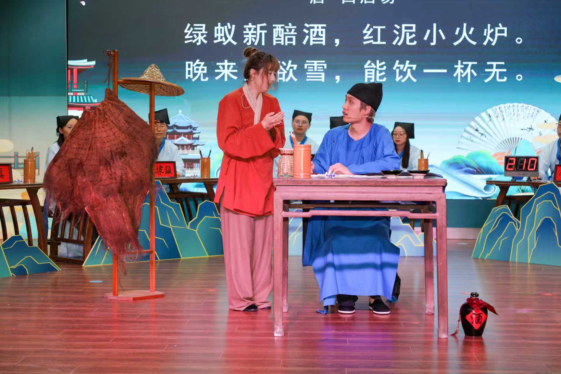 作为本次竞赛中极富妙趣的创新题型“诗词小剧场”,将大家带入沉浸状态中去出题和解题。大学生“演员”们服化道完备,将“试问卷帘人,却道海棠依旧”“故人具鸡黍,邀我至田家”“晚来天欲雪,能饮一杯无”等诗中情境转化为自然质朴的生活日常,令人更好理解诗词的创作背景、诗人的心境。