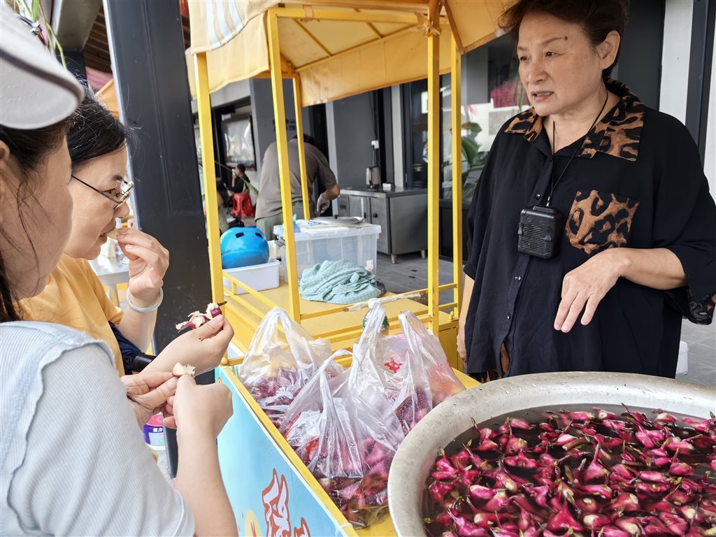 长桌宴旁,热闹的展销区同样人气十足,游客们纷纷驻足采购,这里汇聚了琳琅满目的金山特色好物,既有云酿啤酒、望秦啤酒等多款佳酿,也有张堰闻泰来酱菜这样的地道风味,更有当天现摘的本地葡萄、桃子、南瓜等时令农产。