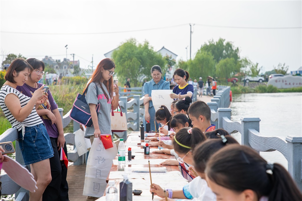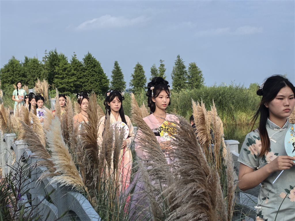 作为沪郊小有名气的“书法之乡”,漕泾自古崇文厚德,书法底蕴深厚,书法教育更贯穿于当地各大学校。走秀现场,老师带领学生在T台旁挥毫泼墨,墨香与湿地的清新气息交织相融。大学生与模特身着太极礼服、传统汉服等民族服饰登场,一举一动间尽显中华传统文化的大气与典雅。“没想到乡村里能有这么高水平的艺术活动,既能看到本土文化,又能感受到国潮魅力,太震撼了!”一名游客激动地表示,此次来漕泾,不仅饱了口福,更饱了眼福,收获满满,以后会经常带家人来游玩。