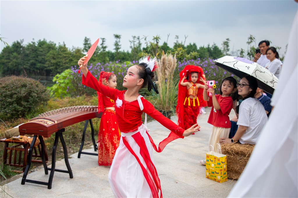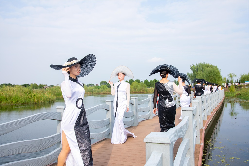 其实早在当日下午,“同心共圆 秋绘华章”庆国庆湿地走秀,在景区的湿地公园内精彩上演。漕泾有着6400年前的冈身遗址,又有着沪派江南的优美水乡风貌,因此也有了“千年拾贝处,东方羊角村”的美誉。