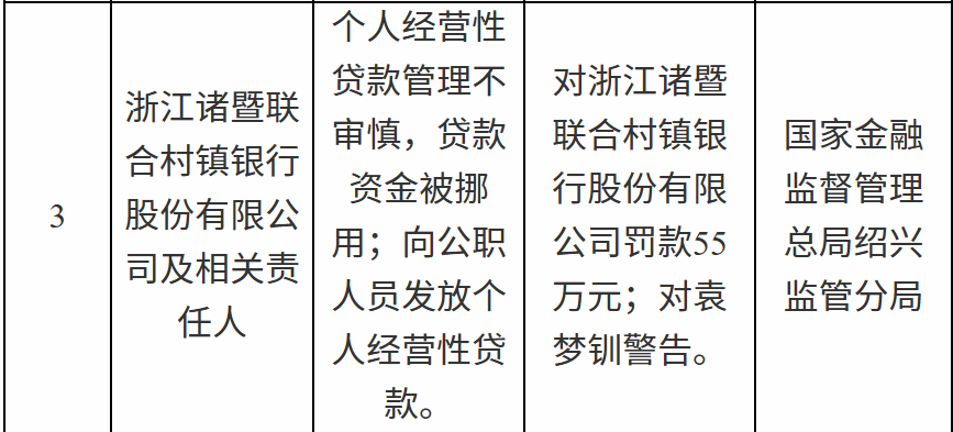 10月9日,国家金融监督管理总局绍兴监管分局行政处罚信息公开表显示,浙江诸暨联合村镇银行股份有限公司及相关责任人因个人经营性贷款管理不审慎,贷款资金被挪用;向公职人员发放个人经营性贷款被罚款55万元;责任人袁某钏被警告。