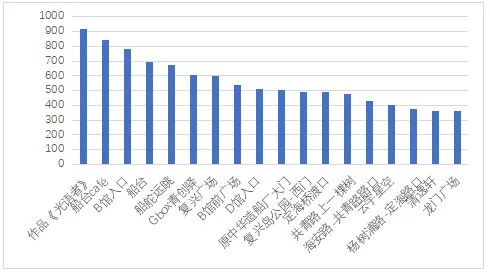 最高频次打卡点:主展区共设有18个打卡点,国庆期间共计打卡1万次,最高频次的打卡点分别是作品《光语者》、船台CAFE、船台、船舵远眺、GBOX青创驿、复兴广场,共计打卡4500次。
