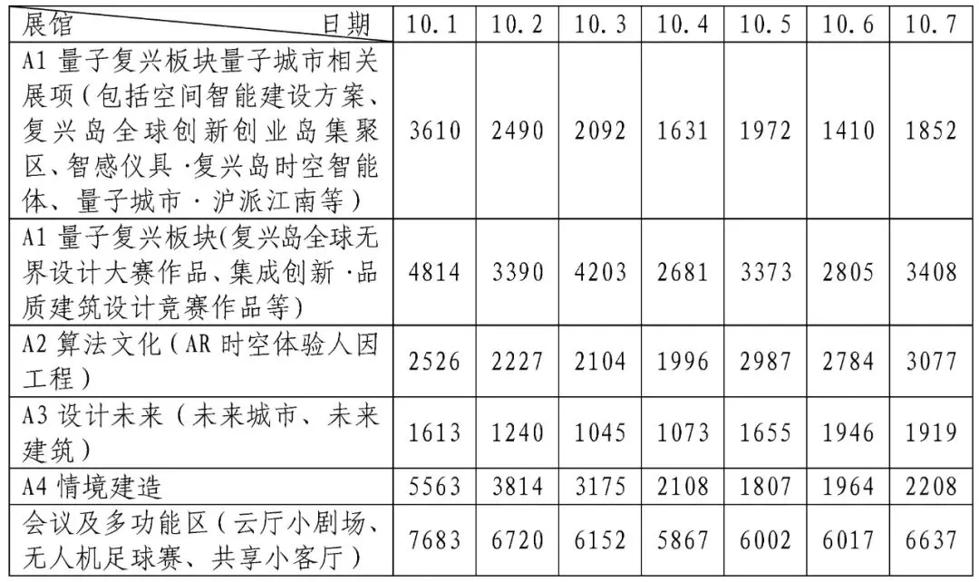 区域热度分布集中。感知系统将A馆分为6个区域,其中会议及多功能区活动密集,吸引观众人次累计达4.5万人次,单日最高近8千人次。情境建造、复兴岛全球无界设计大赛作品、集成创新·品质建筑设计竞赛作品、量子城市相关展项等区域也颇受欢迎,累计观众均突破1万人次。