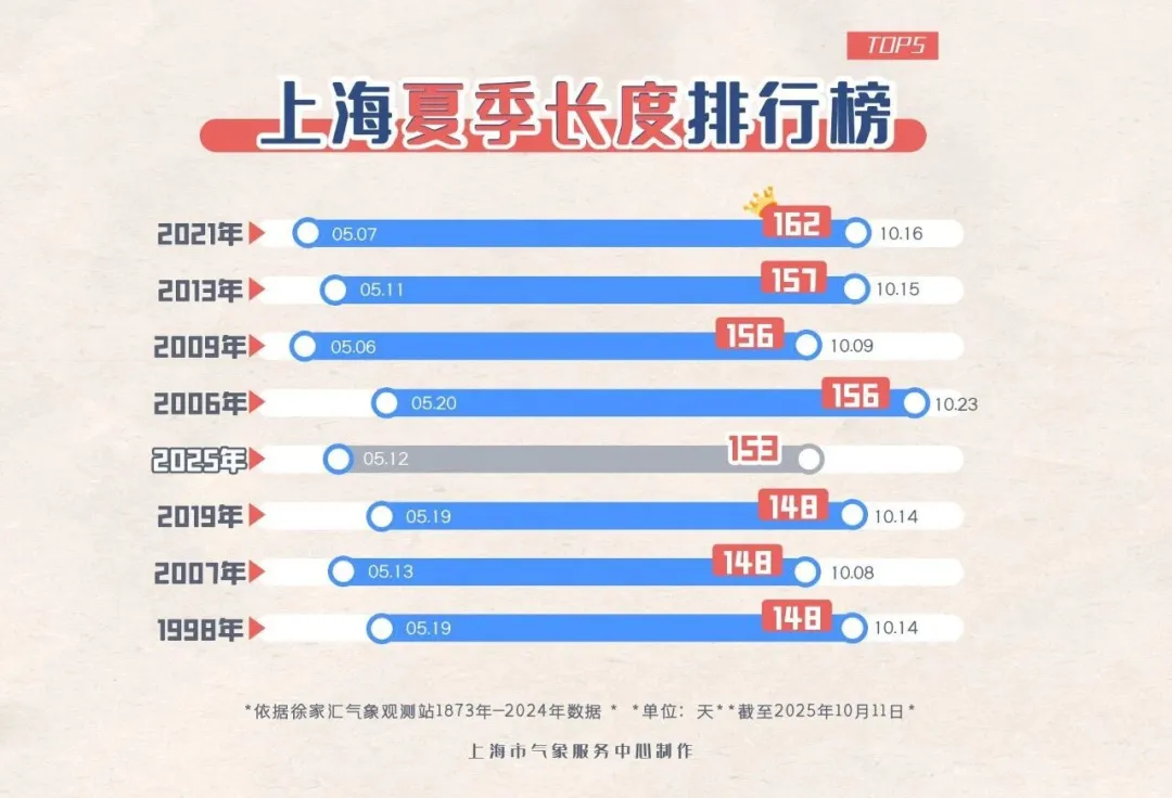 今年气象意义上的夏天可谓“耐力十足”,上海5月12日入夏至今,夏季长度已达153天,且还在持续,夏天之长将毫无悬念地进入历史前三高位。而6月13日至今的四个月121天里,徐家汇站的气温一直保持在20℃以上,时间之长在历史同期也是绝无仅有的。随着副热带高压减退,下周本市气温逐渐下调,受冷空气影响,在本月中旬的尾巴上终于能感受到秋天的气息了。