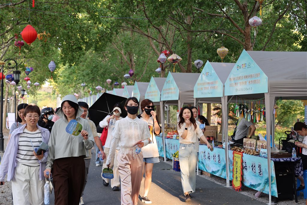 值得一提的是,活动现场,市民游客不仅可以看“村晚”,还能赶一场“花海村集”。当天,在位于花开海上生态园内枫花路沿线,30个特色摊位汇集了金山特色文化体验与优质好物。在本土非遗展示区,金山农民画、金山版画、金山麦秆画、朱泾花灯、土布染织等多样的传统手艺,让市民游客不仅能近距离感受非遗魅力,还能带走特色手作。此外,珠丰大米、良新葱油饼、唐人神肉制品、尚慧水稻米制品、众喜食用油等十余种金山农业与工业优品,也吸引了许多市民游客驻足品尝选购。