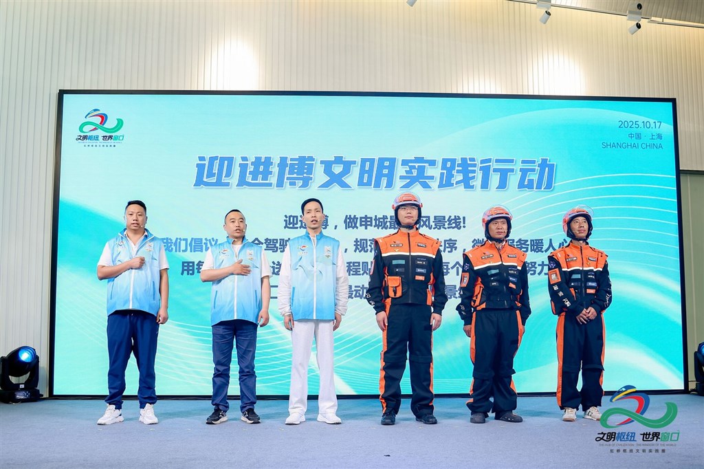 作为服务保障进博会的重点项目,进博会志愿者代表、网约车司机、外卖骑手等新就业群体代表共同上台,发出迎进博文明倡议。这些活跃在枢纽及城市服务一线的群体,佩戴着印有“上海欢迎您”、“共享文明出行”等字样的徽章和贴纸,成为传递城市文明、服务八方来客的流动窗口。