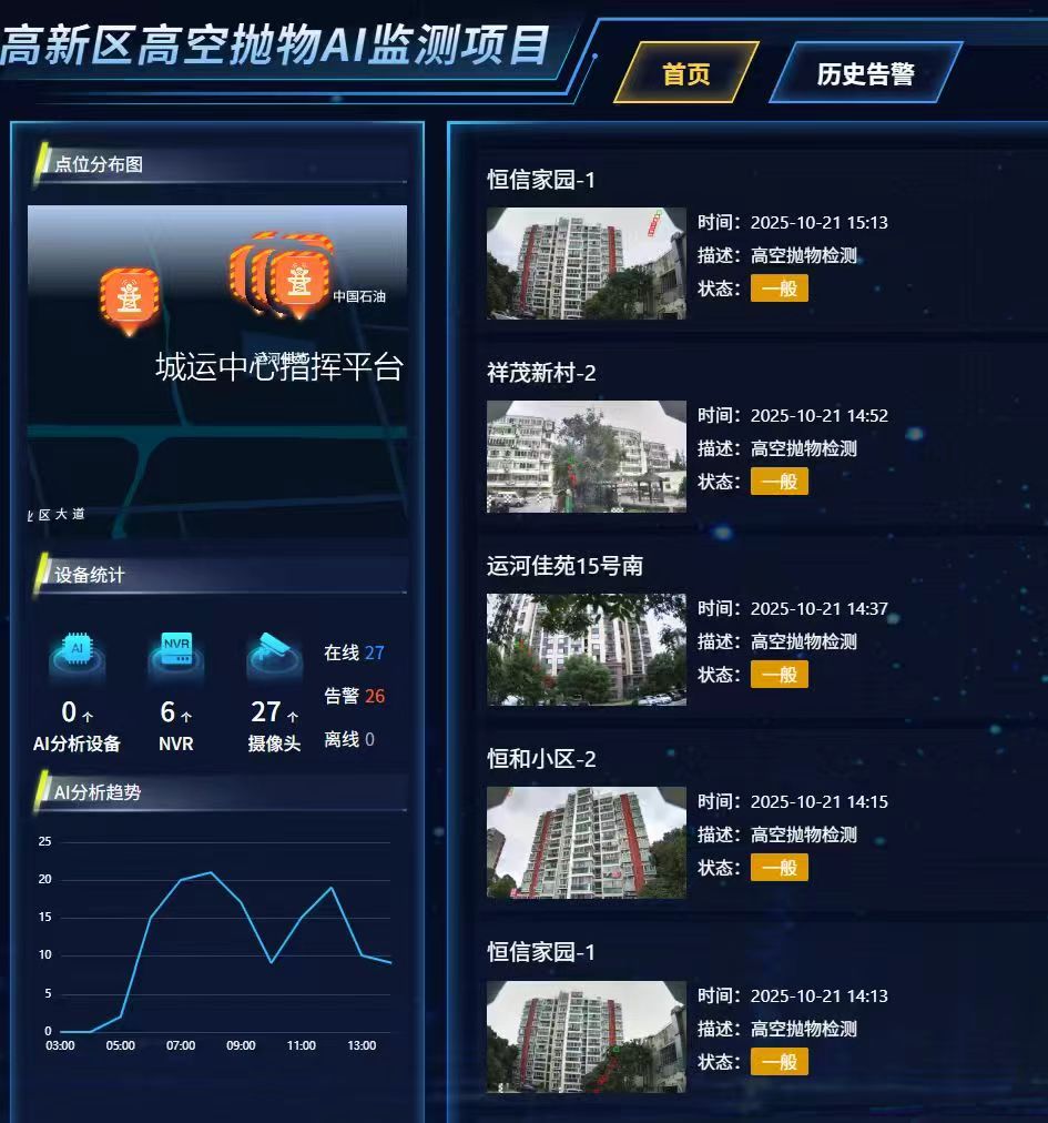 该设备今年8月初开始施工,8月底完成安装及调试,从9月初正式运行以来,日均识别抛物事件10余起,各小区的抛物事件发生率大幅下降。至此,AI监测在镇区实现了9个住宅小区全覆盖,高空抛物这一城市顽疾正在得到有效遏制,居民纷纷表示:“现在走在小区里,心里踏实多了。”