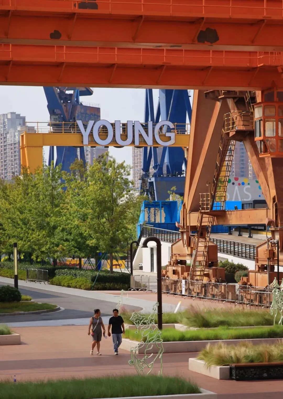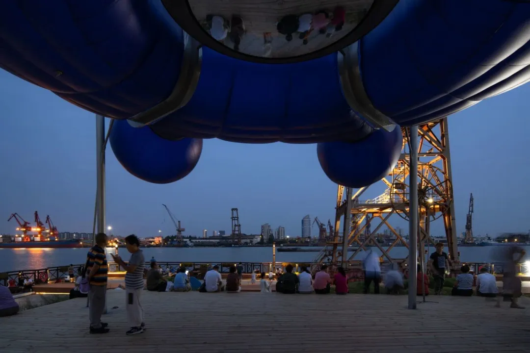 夕阳下的复兴岛,工业遗存、艺术装置与城市天际线构成多层次的城市画卷。