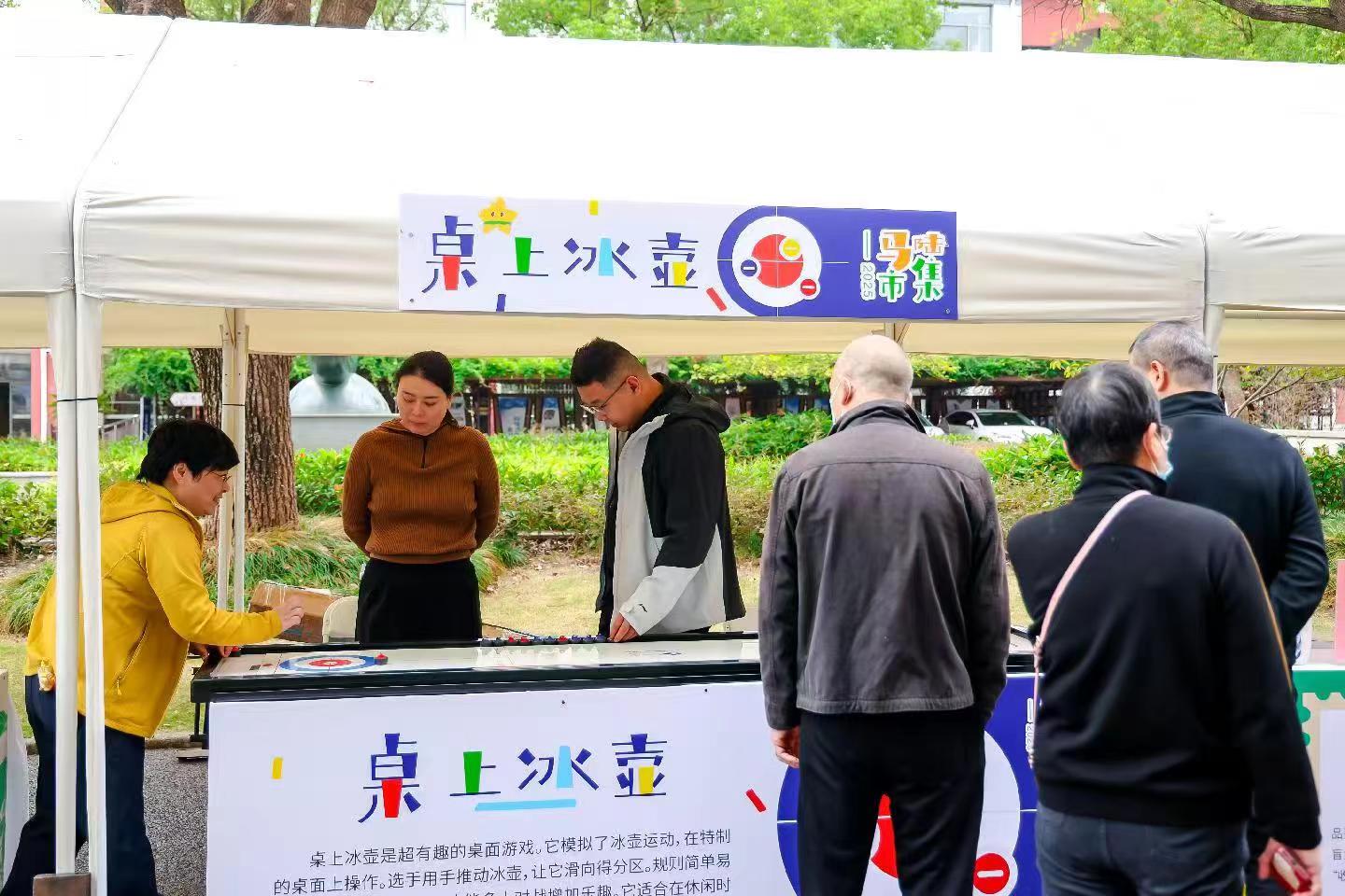 运动会的“场外赛道”同样精彩连连。安踏、红双喜等体育品牌在外场设置展台,桌上冰壶等互动体验让市民大呼过瘾,“邮点意思”集邮文创、压金丝嵌宝、海派玉雕、马陆篾竹编织、苏绣等摊位前人头攒动,呈现一场场集竞技、运动、娱乐、购物和文化体验于一体的狂欢派对。