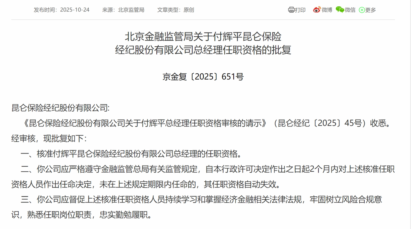 10月24日,北京金融监管局发布关于付辉平昆仑保险经纪股份有限公司总经理任职资格的批复,核准付辉平昆仑保险经纪股份有限公司总经理的任职资格。