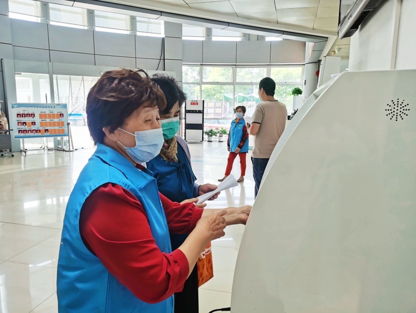 “同馨”银龄助医队,既是“智慧引导员”,也是“秩序守护者”。他们手把手教老人使用智能设备,完成挂号、缴费、查询报告等操作;他们穿梭于各诊区之间,安抚情绪、化解矛盾,把因“不会用”而引发的急躁,转为理解和信任。