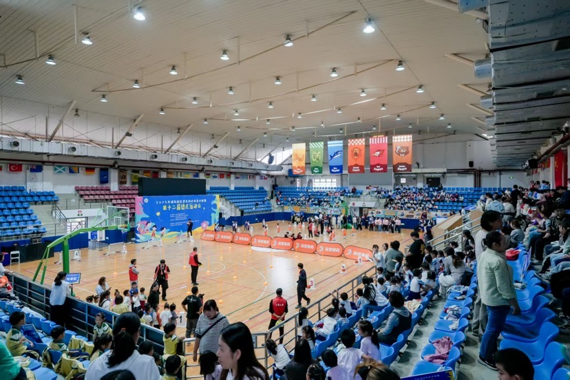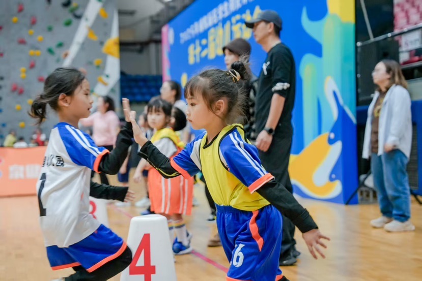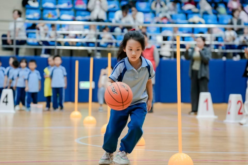决赛日的赛场,俨然一个充满童趣的乐园。在“30秒跳绳”区域,小朋友们手握跳绳,小脸紧绷,专注地一次次跳跃,即便不小心绊到,也立刻捡起绳子继续,那份坚持让在场所有人动容。“篮球行进间绕杆拍球接力”中,孩子们小手拍着篮球,小心翼翼地绕过每个障碍,交接时认真的眼神传递着团队的力量。
