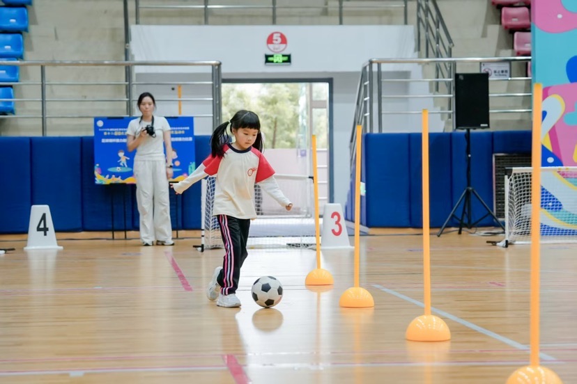 最具挑战的“跳绳拍球迎面接力”项目中,小选手们需要在跳绳和拍球任务间转换,有的孩子拍球时追着球跑,有的跳绳后忘了下一步,这些可爱的瞬间引得场边笑声不断。而在“足球绕杆接力射门”赛场,小朋友们带着足球勇敢前行,射门时的专注模样,不论进球与否,都赢得了热烈的掌声。一位观赛的家长感慨:“看到孩子们在运动中这么快乐,比什么都重要。”
