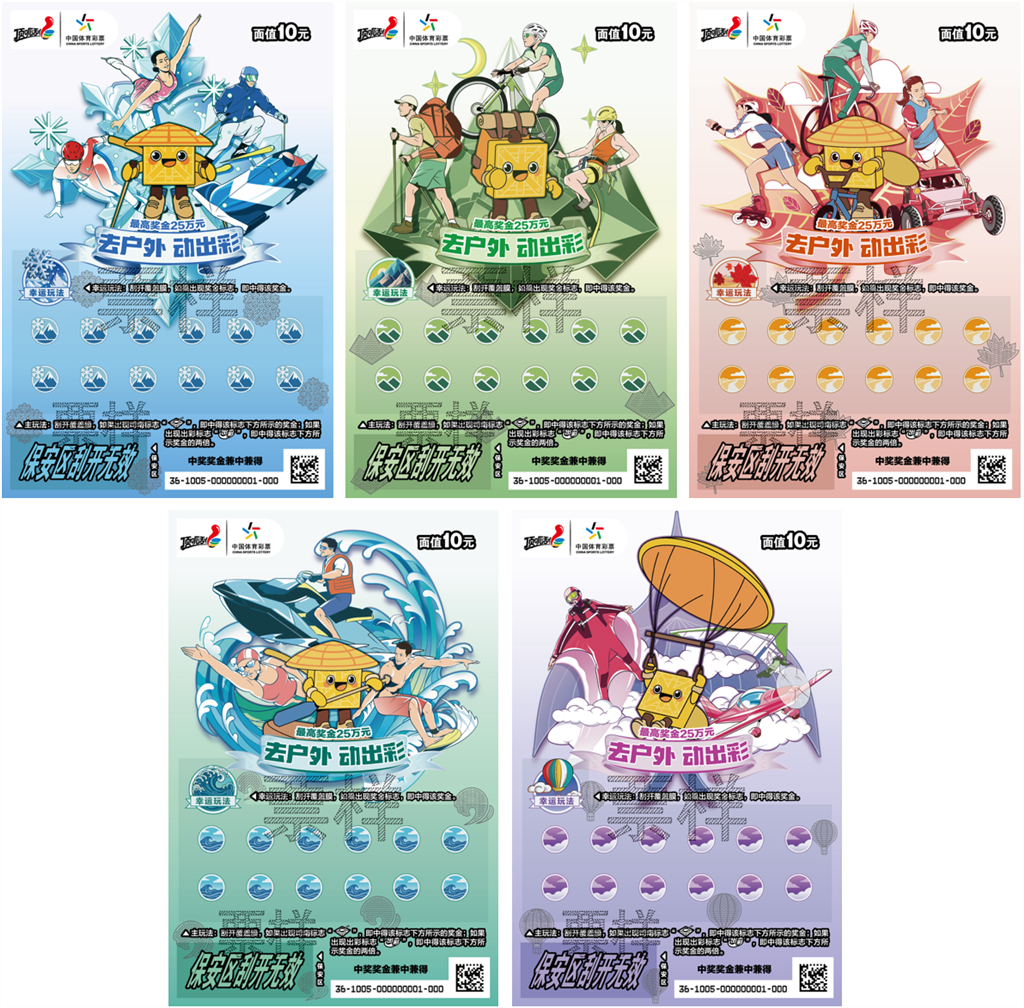 “去户外 动出彩”即开票面值10元,最高奖金为25万元,其共有5个票面场景。票面上的“司南侠”是中国户外运动产业大会的吉祥物,通过它在冰上舞动、在山野徒步、在林间骑行、在水上划桨、在云间穿梭的画面将传统文化和户外精神巧妙融合,向购彩者传递户外运动健康、快乐的生活理念。