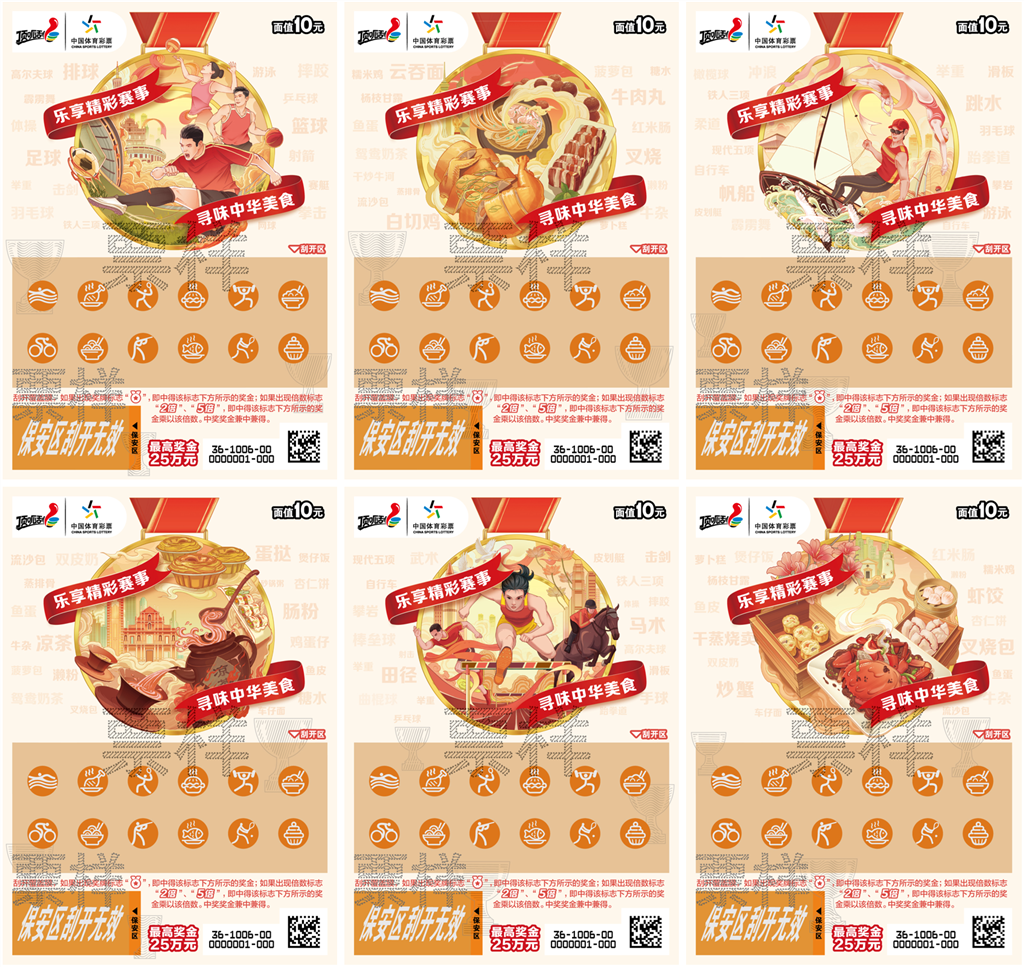 “享赛事 品美食”即开票面值也为10元,最高奖金25万元。该票以“乐享精彩赛事 寻味中华美食”为主题,打造体育与饮食文化的跨界盛宴。票面设计独具匠心,共有6个场景,分别展现了赛事运动精彩瞬间和粤港澳经典美食画面,让购彩者既可以感受体育赛事的激情又可以领略中华饮食文化的博大精深。