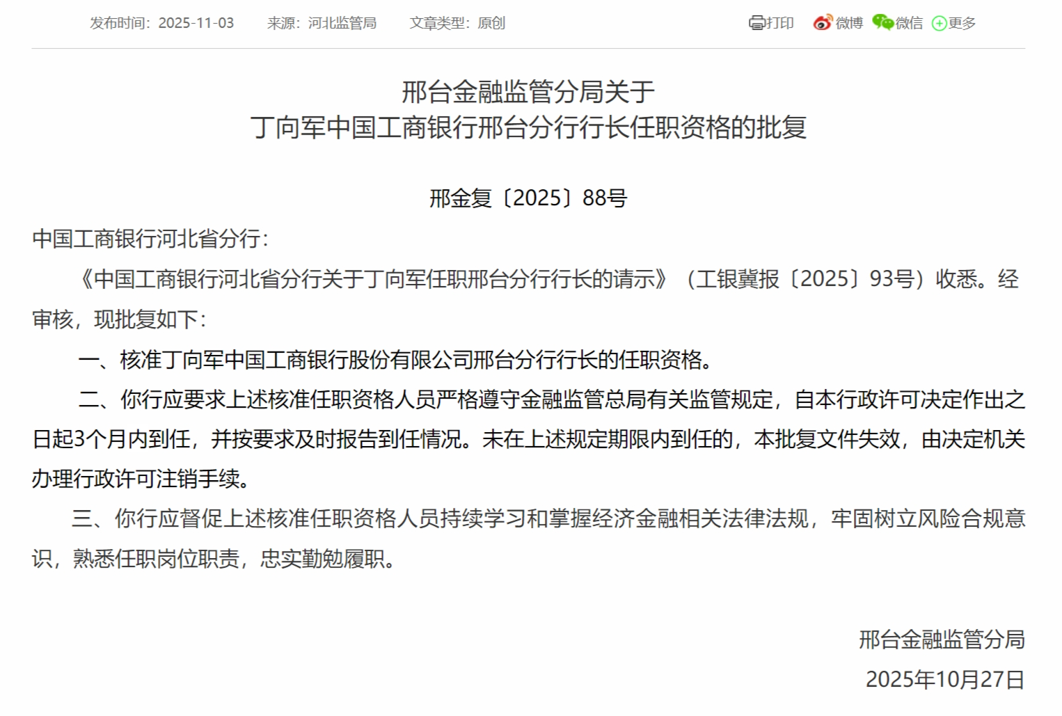 11月3日,邢台金融监管分局发布关于丁向军中国工商银行邢台分行行长任职资格的批复,核准丁向军中国工商银行股份有限公司邢台分行行长的任职资格。