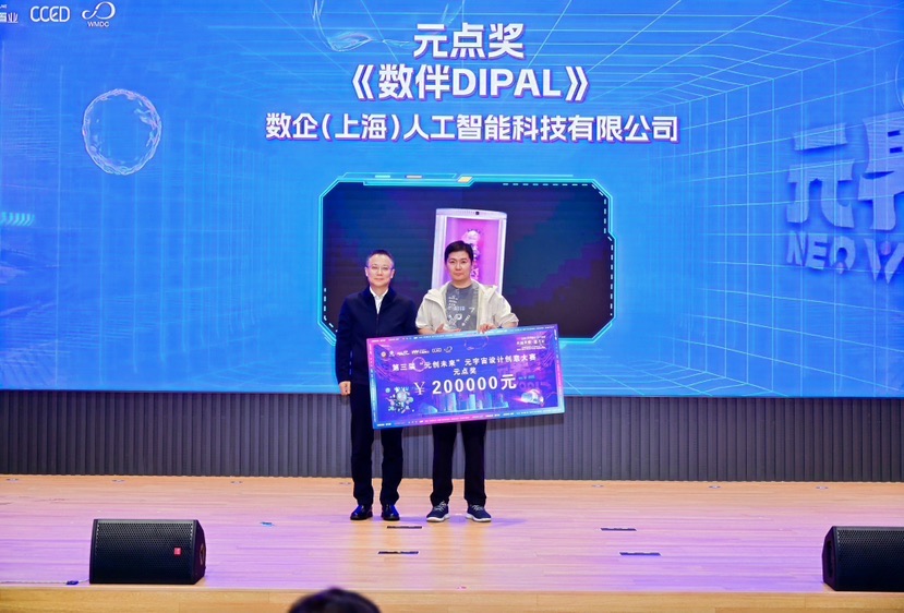 奖项背后,是创作者对技术边界的突破与对未来生活的想象。颁奖仪式上,赛事最高荣誉“元点奖”获奖者数企(上海)人工智能科技有限公司代表登台展示作品《数伴》,生动诠释了大赛“元创未来、智启新境”的理念——通过推动人工智能技术在元宇宙创意设计中的应用,助力漕河泾元宇宙街区建设,努力打造可落地、可实施的应用示范标杆,聚集元宇宙人才资源,构建街区创新产业生态。