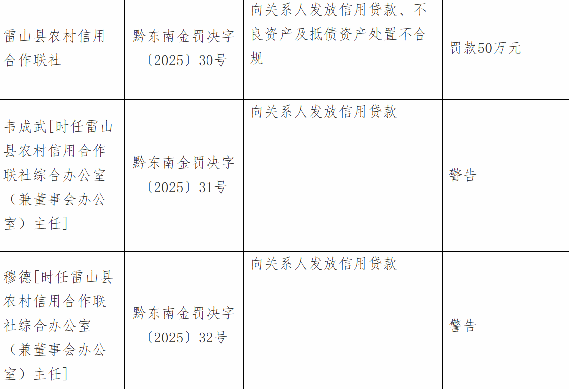 11月18日,国家金融监督管理总局黔东南监管分局行政处罚信息公开表显示,雷山县农村信用合作联社因向关系人发放信用贷款、不良资产及抵债资产处置不合规被罚款50万元;韦某武、穆某因向关系人发放信用贷款被警告;杨某良因向关系人发放信用贷款、不良资产及抵债资产处置不合规被警告并罚款5万元。