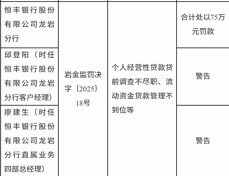 11月25日,龙岩金融监管分局行政处罚信息公示表显示,恒丰银行股份有限公司龙岩分行因个人经营性贷款贷前调查不尽职、流动资金贷款管理不到位等被罚款75万元;邱某阳、廖某生被警告。