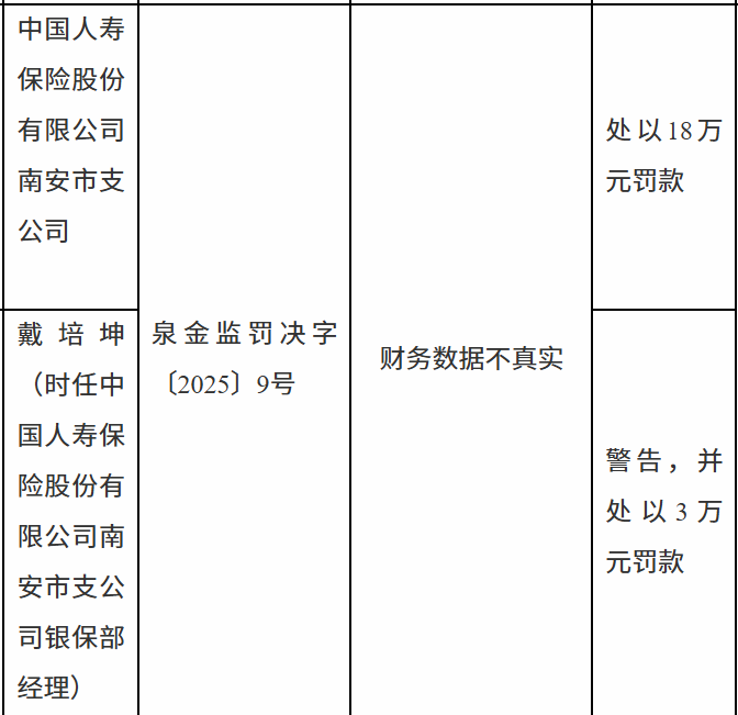 11月25日,泉州金融监管分局行政处罚信息公示表显示,中国人寿保险股份有限公司南安市支公司因财务数据不真实被罚款18万元;戴某坤被警告,并处以3万元罚款。