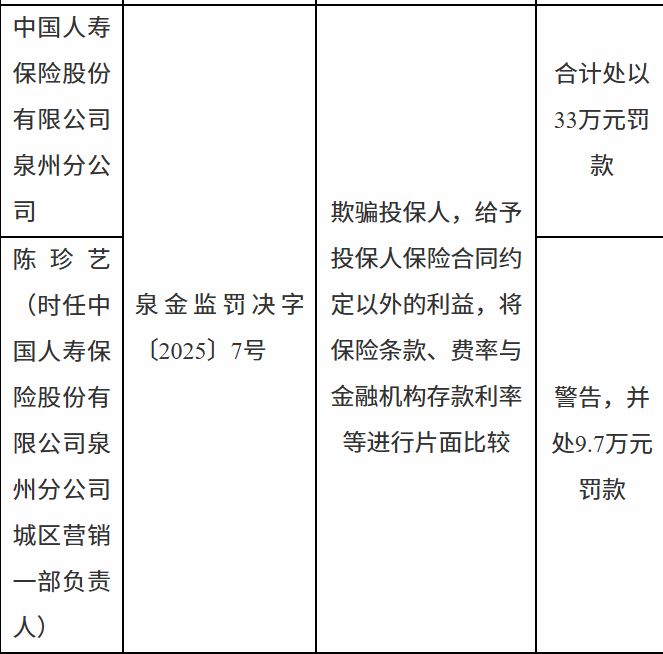 11月25日,泉州金融监管分局行政处罚信息公示表显示,中国人寿保险股份有限公司泉州分公司因欺骗投保人,给予投保人保险合同约定以外的利益,将保险条款、费率与金融机构存款利率等进行片面比较被合计处以33万元罚款;陈某艺被警告,并处9.7万元罚款。