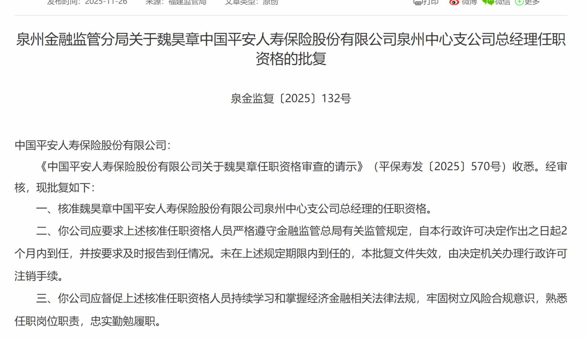11月26日,泉州金融监管分局发布关于魏昊章中国平安人寿保险股份有限公司泉州中心支公司总经理任职资格的批复,核准魏昊章中国平安人寿保险股份有限公司泉州中心支公司总经理的任职资格。