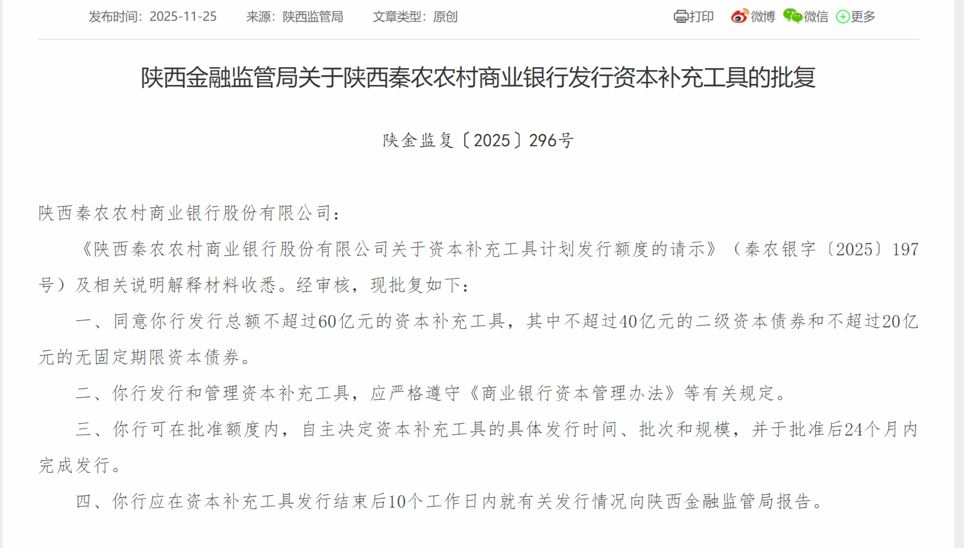 11月25日,陕西金融监管局发布关于陕西秦农农村商业银行发行资本补充工具的批复,同意该行发行总额不超过60亿元的资本补充工具,其中不超过40亿元的二级资本债券和不超过20亿元的无固定期限资本债券。