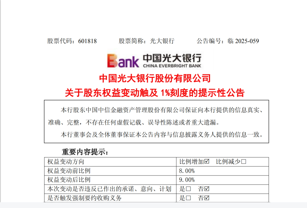 中信金融资产于2025年7月24日至2025年11月27日期间,增持光大银行A股股份约2.75亿股,H股股份约3.15亿股,合计占该行总股本的1.00%。中信金融资产持股比例由8.00%增加至9.00%,触及1%的整数倍。