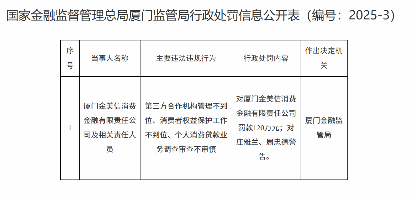 12月1日,国家金融监督管理总局厦门监管局行政处罚信息公开表显示,厦门金美信消费金融有限责任公司及相关责任人员因第三方合作机构管理不到位、消费者权益保护工作不到位、个人消费贷款业务调查审查不审慎被罚款120万元;庄某兰、周某德被警告。