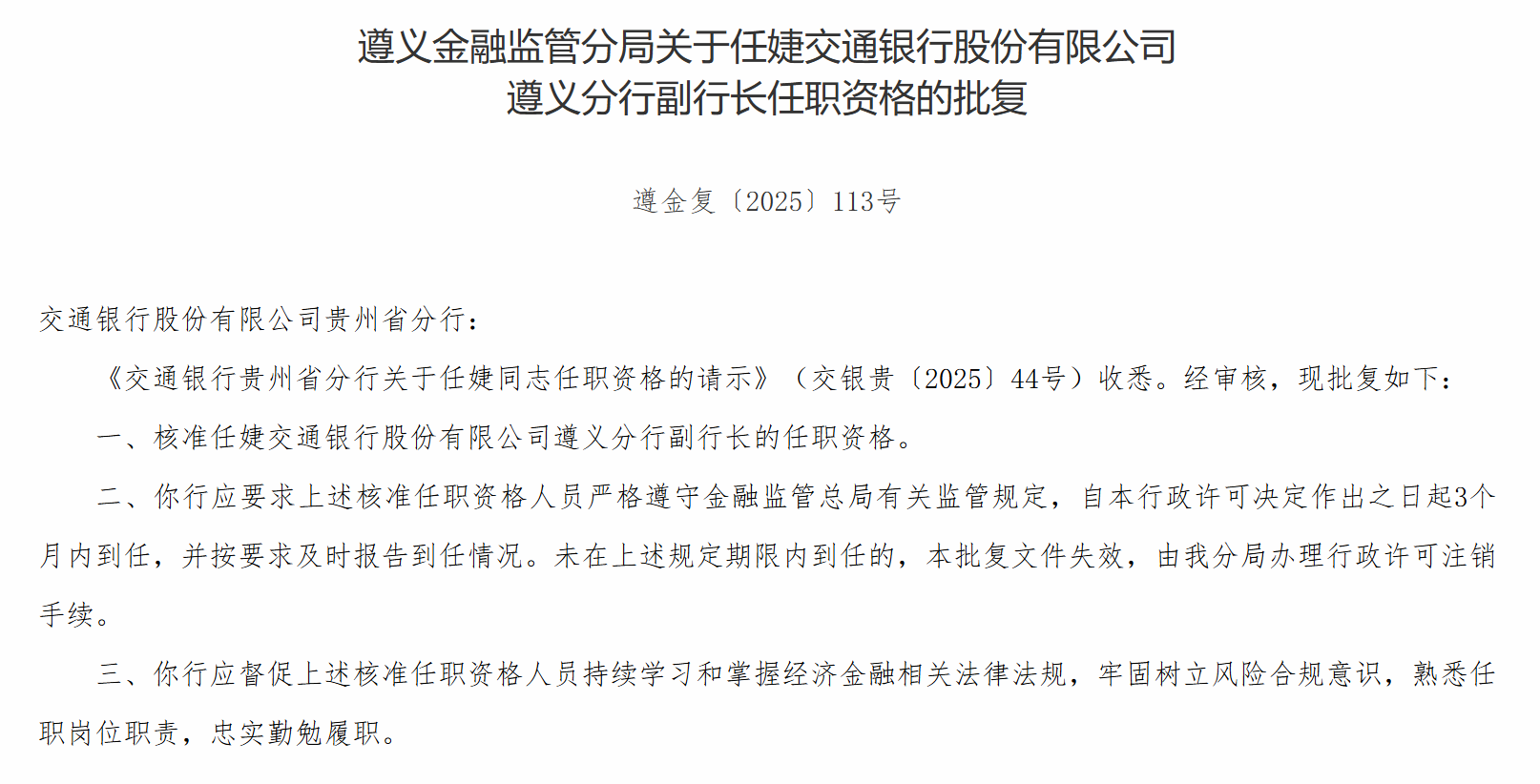12月3日,遵义金融监管分局发布关于任婕交通银行股份有限公司遵义分行副行长任职资格的批复,核准任婕交通银行股份有限公司遵义分行副行长的任职资格。