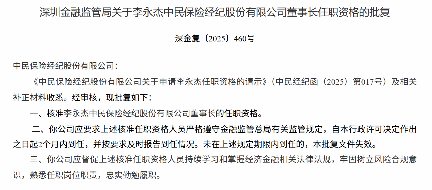 12月5日,深圳金融监管局发布关于李永杰中民保险经纪股份有限公司董事长任职资格的批复,核准李永杰中民保险经纪股份有限公司董事长的任职资格。