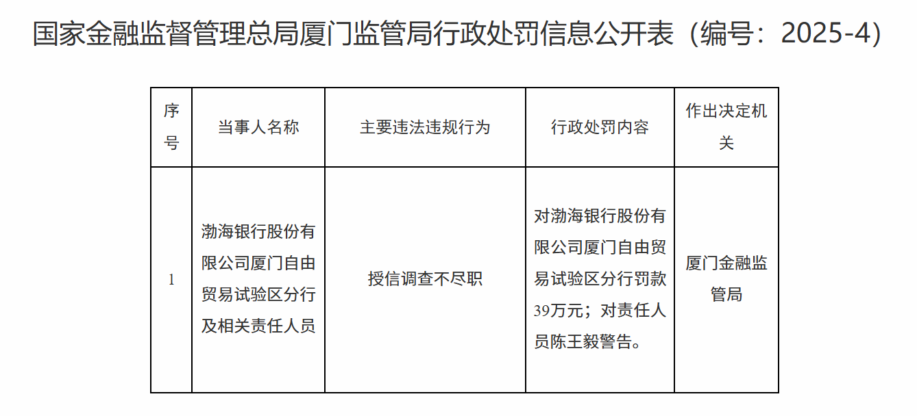 渤海银行厦门自由贸易试验区分行因授信调查不尽职被罚款39万元