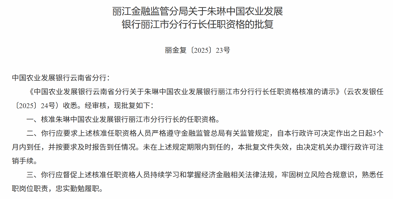 12月18日,丽江金融监管分局发布关于朱琳中国农业发展银行丽江市分行行长任职资格的批复,核准朱琳中国农业发展银行丽江市分行行长的任职资格。
