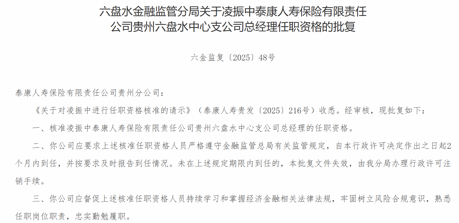 12月18日,六盘水金融监管分局发布关于凌振中泰康人寿保险有限责任公司贵州六盘水中心支公司总经理任职资格的批复,核准凌振中泰康人寿保险有限责任公司贵州六盘水中心支公司总经理的任职资格。