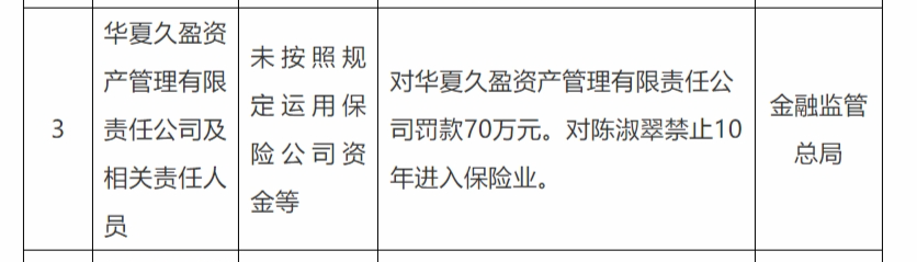 12月19日,国家金融监督管理总局行政处罚信息公示列表显示,华夏久盈资产管理有限责任公司,未按照规定运用保险公司资金等,被罚款70万元;相关责任人陈淑翠被禁止10年进入保险业。