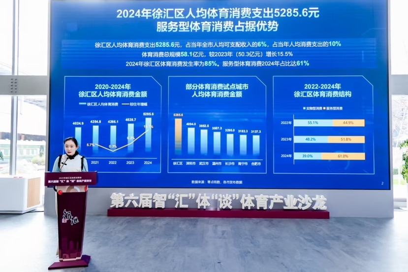 上海市体育局副局长许琦、徐汇区人民政府副区长魏兰出席活动,并为徐汇区体育产业联盟的两位新成员——滔搏投资(上海)有限公司、融梦跃视(上海)体育科技有限公司进行授牌。成立6年的徐汇区体育产业联盟成员单位也增加至23家,进一步拓宽了区域体育产业生态圈。2025年徐汇区加快体育产业发展资金扶持名单也在现场揭晓,每步科技(上海)有限公司、上海乐动力体育文化有限公司等六家机构主办的赛事活动获得扶持资金,展现了政府对创新融合办赛的有力支持。活动中还发布了《2024年度徐汇区体育消费状况报告》,徐汇区2024年人均体育消费支出达到了5285.6元,稳居全国城区第一梯队,展现了强劲的体育消费活力,其中服务型体育消费占比更是全线增长,体育赛事与商旅文体展活动对于消费的带动效应明显。