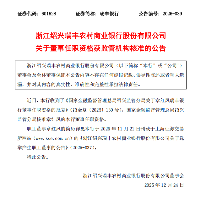 12月24日,浙江绍兴瑞丰农村商业银行股份有限公司发布关于董事任职资格获监管机构核准的公告,国家金融监督管理总局绍兴监管分局已核准章红凤的本行董事任职资格。