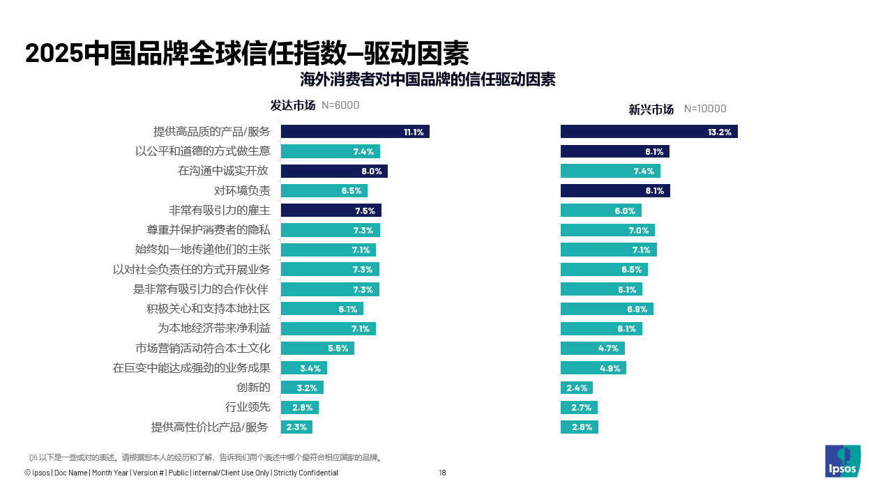 报告揭示,中国品牌信任的驱动因素已从单一产品维度向多元价值延伸。“提供高品质的产品/服务”仍是最核心诉求。同时,“始终如一地传递他们的主张”、“为本地经济带来净利益”和“积极关心和支持本地社区”等因素重要性显著提升,显示出品牌本地化融入与社会责任日益关键。