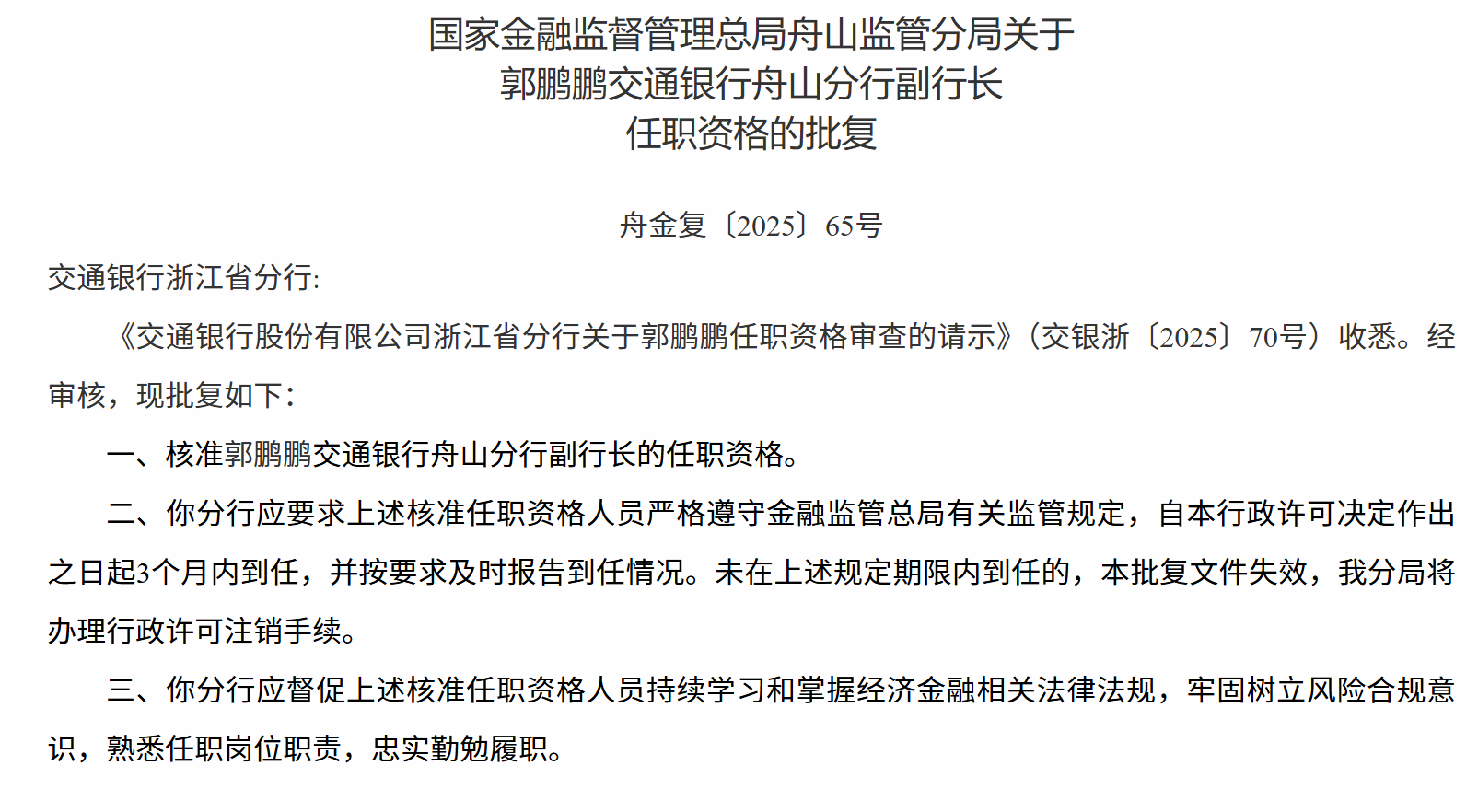 郭鹏鹏获批担任交通银行舟山分行副行长