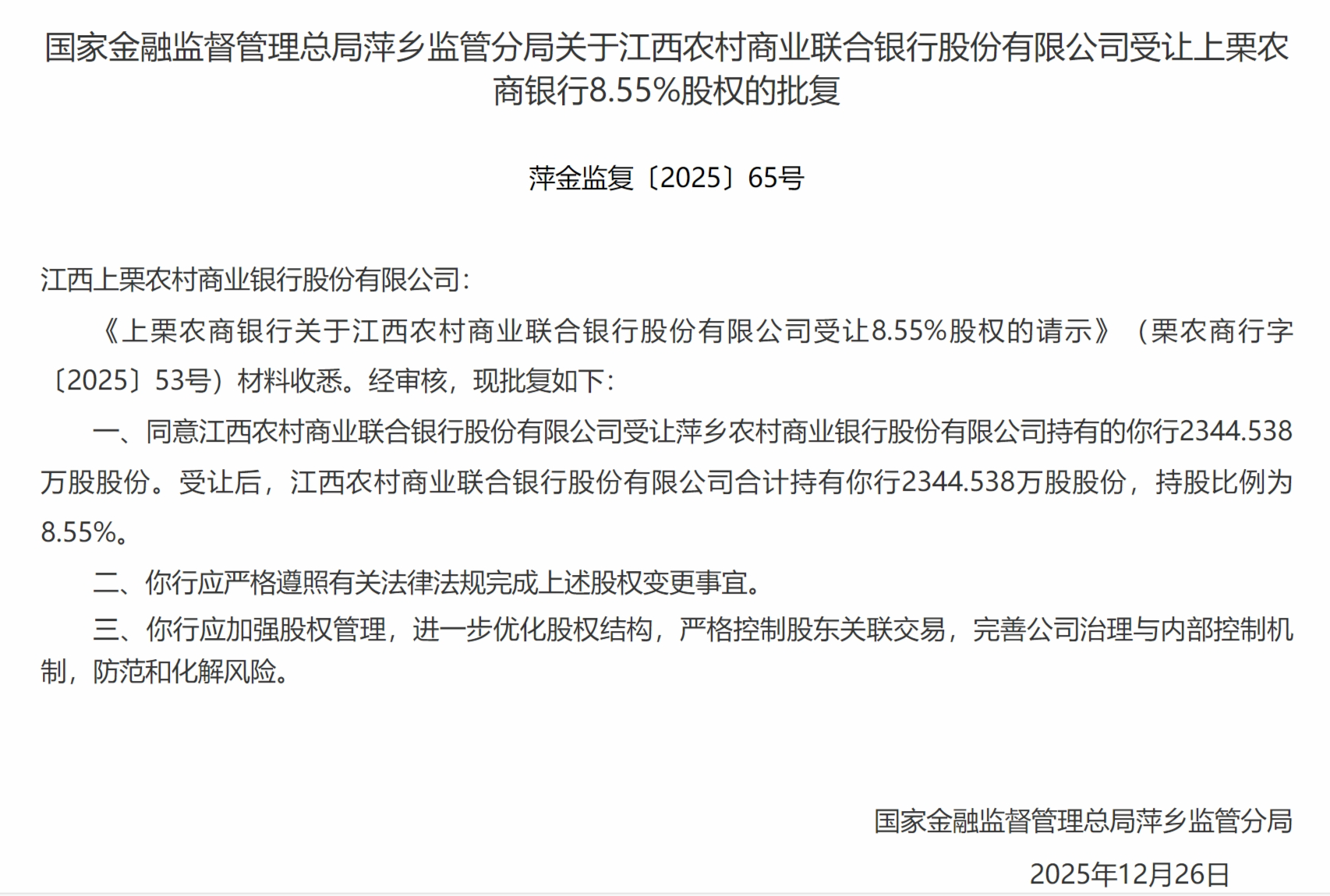 12月26日,国家金融监督管理总局萍乡监管分局发布关于江西农村商业联合银行股份有限公司受让上栗农商银行8.55%股权的批复,同意江西农村商业联合银行股份有限公司受让萍乡农村商业银行股份有限公司持有的你行2344.538万股股份。受让后,江西农村商业联合银行股份有限公司合计持有你行2344.538万股股份,持股比例为8.55%。