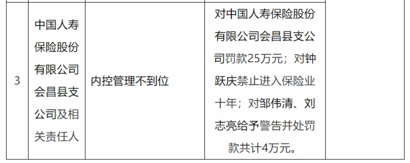 中国人寿会昌县支公司因内控管理不到位被罚款25万元,一名责任人被禁业10年