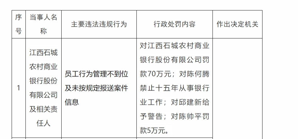 12月26日,国家金融监督管理总局赣州监管分局行政处罚信息公开表显示,江西石城农村商业银行股份有限公司,员工行为管理不到位及未按规定报送案件信息,被罚款70万元;相关责任人陈何腾被禁止十五年从事银行业工作;邱建新被给予警告;陈帅平被罚款5万元。